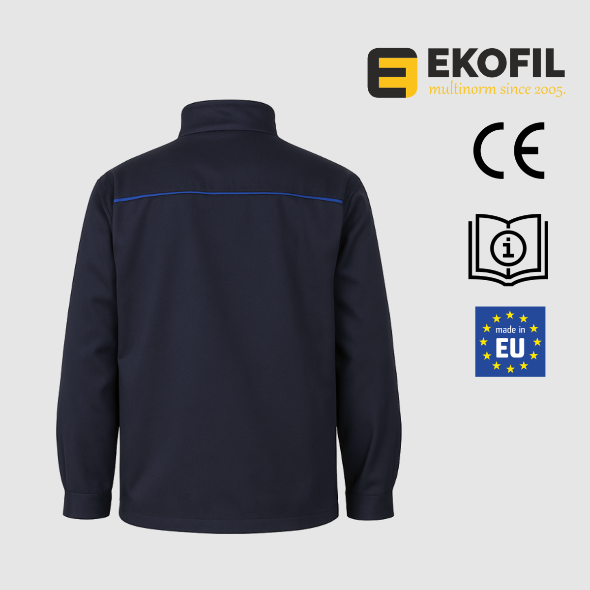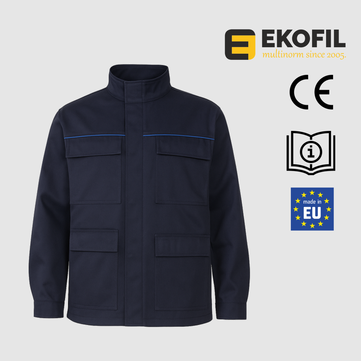 Dvostruko kopčanje jakne izvedeno je metalnim zatvaračem koji je dodatno zaštićen preklopom na skrivenu metalnu pritisnu dugmad.
